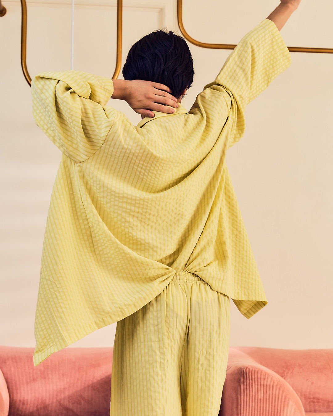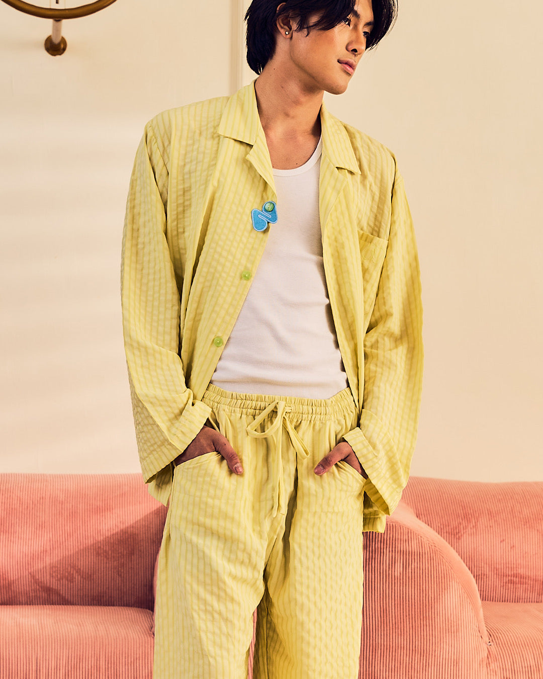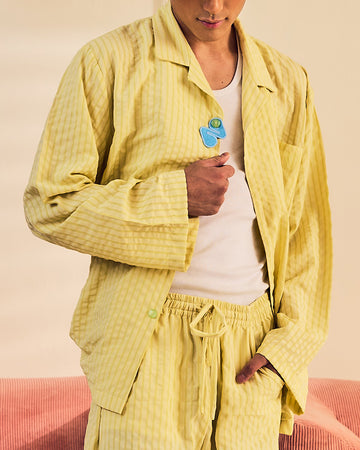 Our new long sleeve pajama top in Butter Bell. Designed to fit loose, take your normal size. Gian is wearing a size M.View Fitting Guide & FAQ here. Care Instructions: